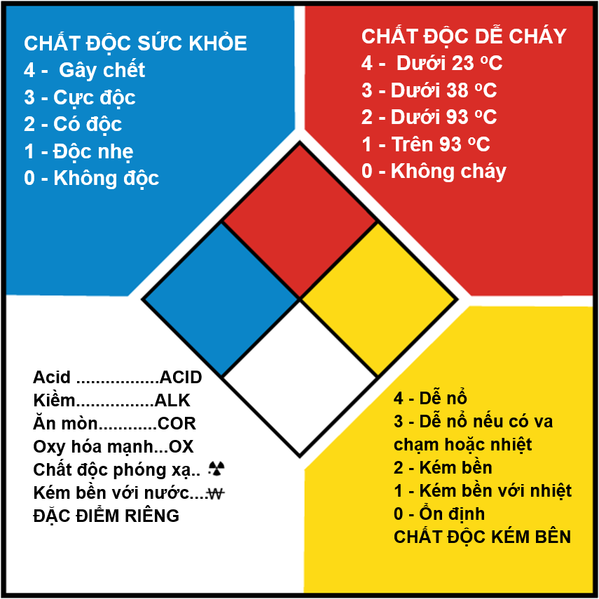 - Màu vàng (kèm số) cho biết mức độ hoạt động của hóa chấtMàu trắng cung cấp một số đặc điểm riêng của hóa chất2.Cách sắp xếp hóa chất phòng thí nghiệm