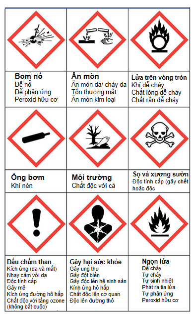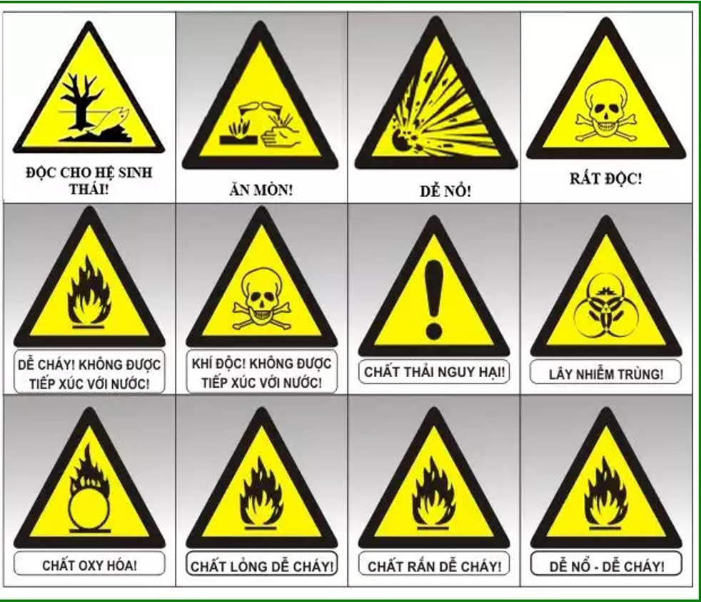 Có thể bắt gặp các ký hiệu tượng hình cung cấp một số thông tin cảnh báo về nguy cơ cháy nổ, độc tính với người và môi trường... trên nhãn hóa chất.